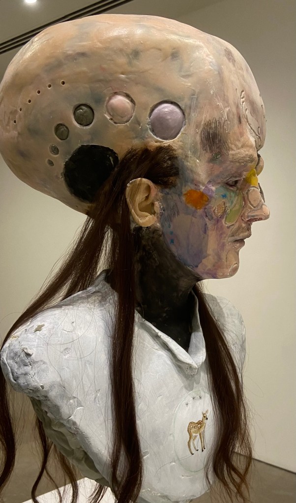 C’est Shaman (2023), la dix-neuvième pièce de l’exposition, qui incarne emblématiquement cette tension entre créateur et créature. Il est magnifique, beau comme pièce et comme être, un superbe visage au nez droit et à l’arc sourcilière froncée qui se tient droit, digne, fixant de haut le spectateur avec son air sérieux, mélancolique, supportant le poids de son énorme crâne charnel, difforme, un œuf beige raturé de petites collines lisses, des taches bleuâtres du réseau de veines sous sa peau. La ligne agile de sa mâchoire souligne ses pommettes et se fond dans la racine des longues mèches de cheveux qui se rangent derrière ses oreilles et tombent sur ses épaules. Qui est-il? Dans la documentation éducative assemblée par l’équipe de la galerie, on trouve une comparaison à Atlas, mise en scène pour décrire La Charge. « Sommes-nous devant une réinvention du titan Atlas condamné à porter le poids du monde? (…) est-ce l’affaire d’un seul titan? [porter le poids du monde] devrait-il nécessiter une communauté hybride, mutante, composite, une agora ouverte et diverse? » – on parle ici du grand ange de La Charge, mais c’est Shaman qui m’a frappé comme figure alourdie.